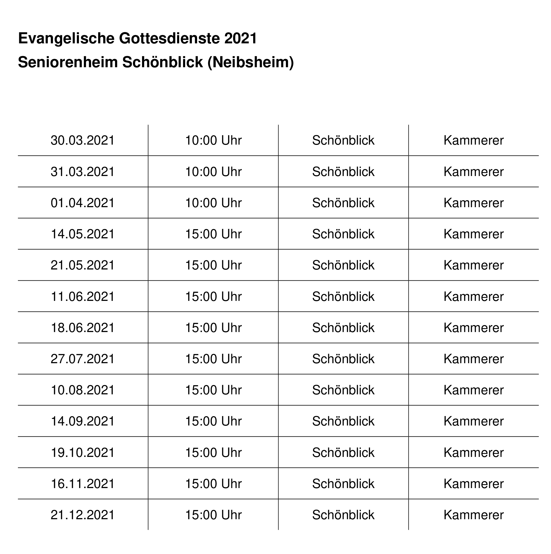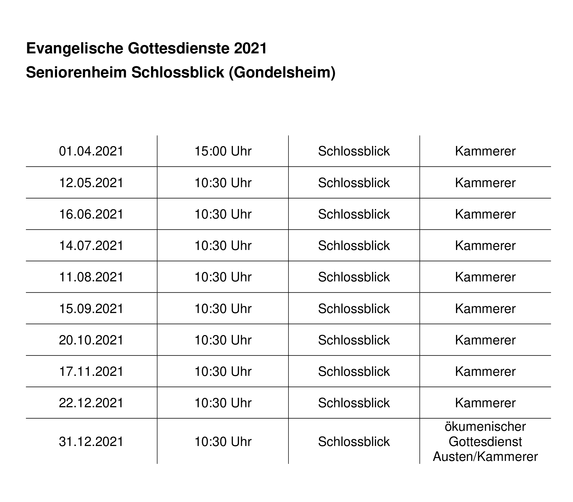 Wir feiern regelmäßig Gottesdienste in den Seniorenheimen in Neibsheim und Gondelsheim, genau wie unsere katholische Schwestergemeinde. Hier finden Sie den Plan für das aktuelle Jahr.